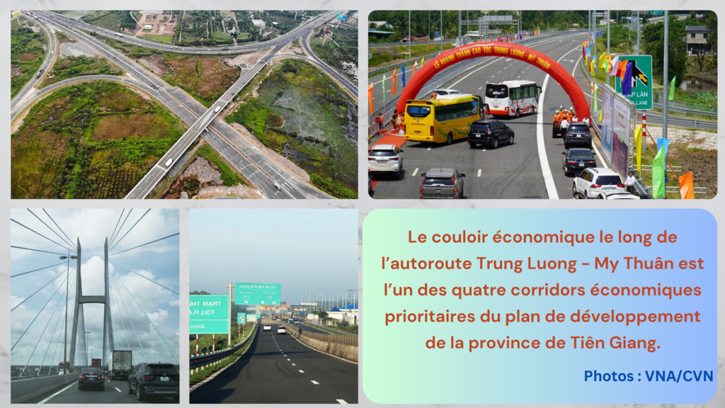 Le plan directeur de Tiên Giang identifie clairement les orientations et les priorités de développement, notamment deux grands centres écologiques (centre économique marin Go Công Dông - Tân Phu Dông et la région écologique industrielle de Tân Phuoc), la zone riveraine de la rivière Tiên (bras antérieur du Mékong) planifiée pour devenir un axe urbain riverain (principalement pour le développement touristique), quatre corridors économiques (couloir économique le long de l'autoroute Trung Luong - My Thuân, celui du long de la Route nationale 1, celui du long de la route côtière et de la route nationale 50, celui du long de la rivière Tiên reliant les zones urbaines et industrielles au delta du Mékong)...