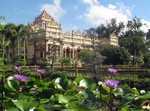 La pagode conjugue admirablement les styles khmer, chinois et français. Avec quatre compartiments totalisant 14.000 m², le bâtiment ressemble à un grand pavillon asiatique soutenu par des colonnes de style roman. La porte d’entrée à trois niveaux a été réalisée par les artisans de Huê en 1933. Les portails latéraux sont richement ornés de mosaïques et de céramiques multicolores qui évoquent les contes bouddhistes et leurs animaux légendaires dragons, licornes, tortues et phénix.