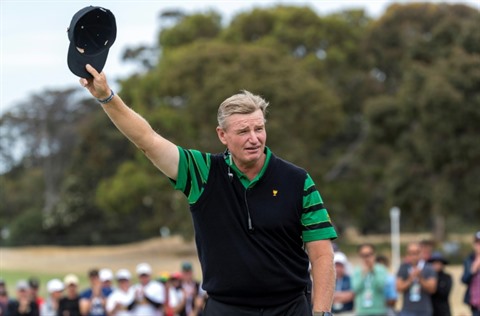 | Le Sud-Africain Ernie Els, capitaine de l'équipe internationale, salue la foule à la fin de la Presidents Cup de golf à Melbourne le 15 décembre. |