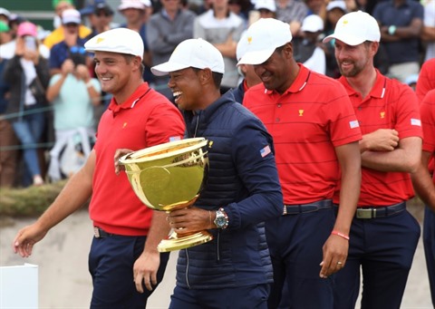 | Le capitaine américain Tiger Woods avec la Presidents Cup à la main au milieu de ses partenaires de l'équipe des États-Unis victorieuse à Melbourne le 15 décembre. |