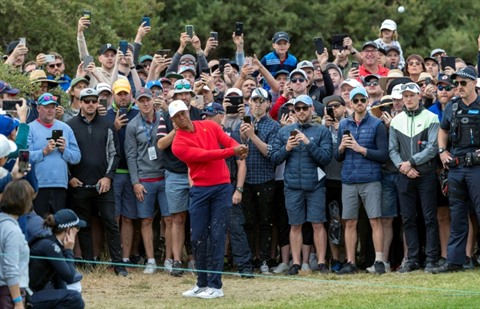 | Le capitaine américain Tiger Woods sort du rough au 1er trou du dernier jour de la Presidents Cup remportée par l'équipe des États-Unis à Melbourne le 15 décembre 2019. |