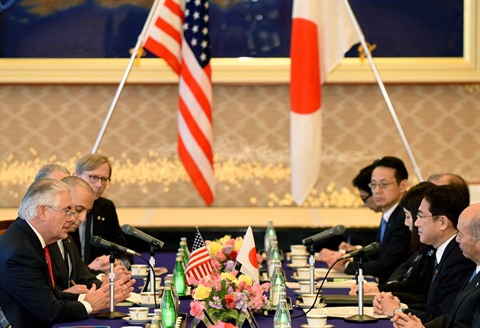 | Entretien entre le secrétaire d'État américain, Rex Tillerson (gauche), et son homologue nippon, Fumio Kishida, (2e à droite), le 16 mars à Tokyo. |