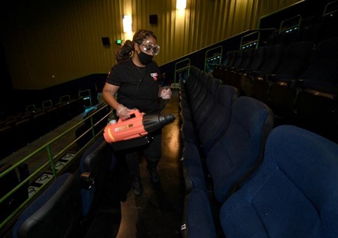 | Une employée d'un cinéma de Las Vegas désinfecte des fauteuils. |