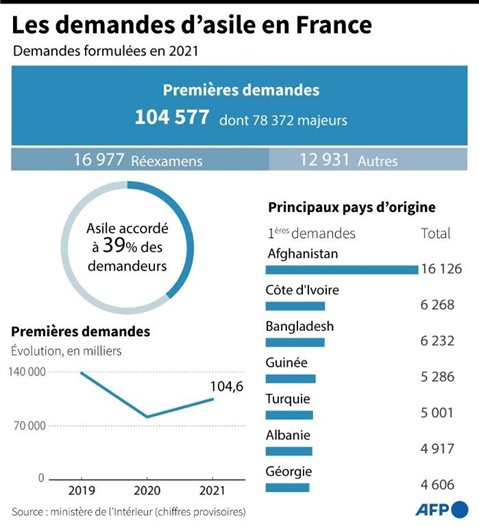 | Données clés sur les demandes d'asile en 2021 en France selon les statistiques du ministère de l'Intérieur. |