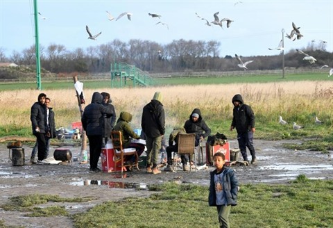 | Des migrants dans un camp à Calais, le 1er décembre 2021. |