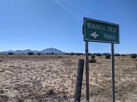 | Un panneau indiquant le chemin vers le ranch Bonanza Creek à Santa Fe, dans le Nouveau-Mexique, le 22 octobre 2021. |