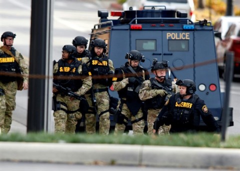 | Des policiers américains sur un parking du campus de l'université de l'État de l'Ohio, à Columbus, le 28 novembre. |