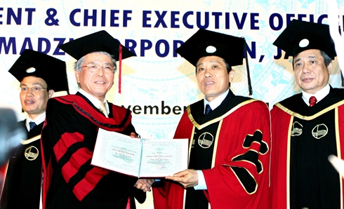 | Le prof.-Docteur Mai Trong Nhuân (droite), directeur de l'Université nationale de Hanoi, remet le diplôme de docteur honoris causa à Akira Nakamoto. |