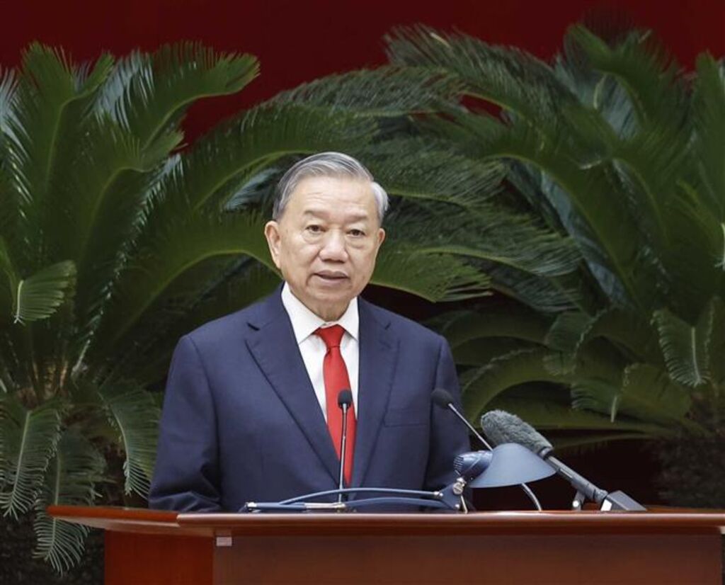 | Le secrétaire général du Parti et président de la République, Tô Lâm, prenant la parole lors de la conférence. |