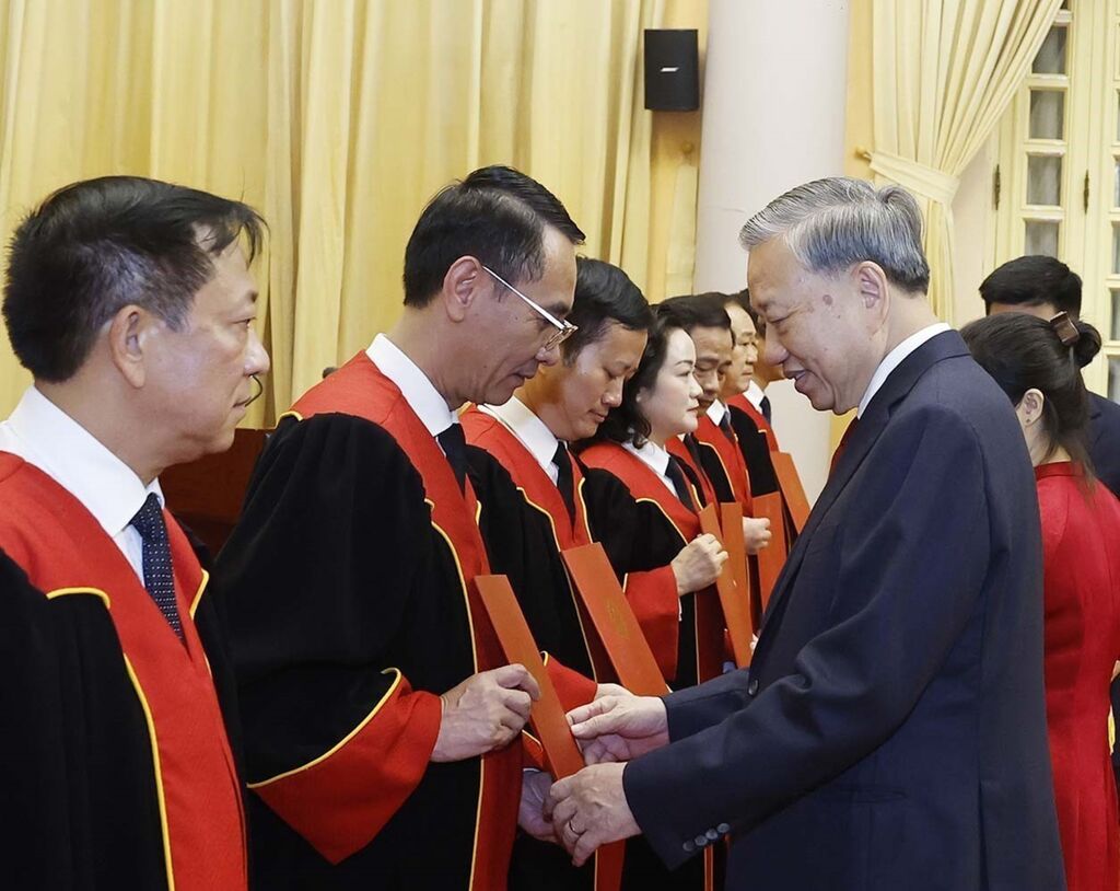 | Le secrétaire général du Parti et président, Tô Lâm, remet les décisions de nomination des juges de la Cour populaire suprême. |