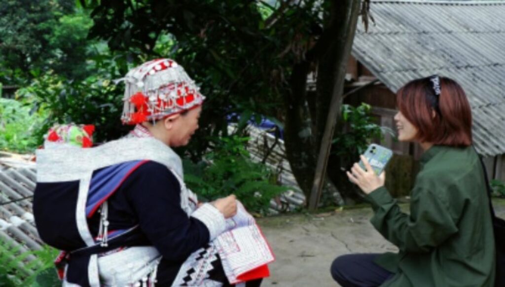 | Un membre de TỎA lors d’un voyage de terrain à Lào Cai en juin 2024, écoutant et recueillant une histoire culturelle auprès d’une femme Dao Rouge. |