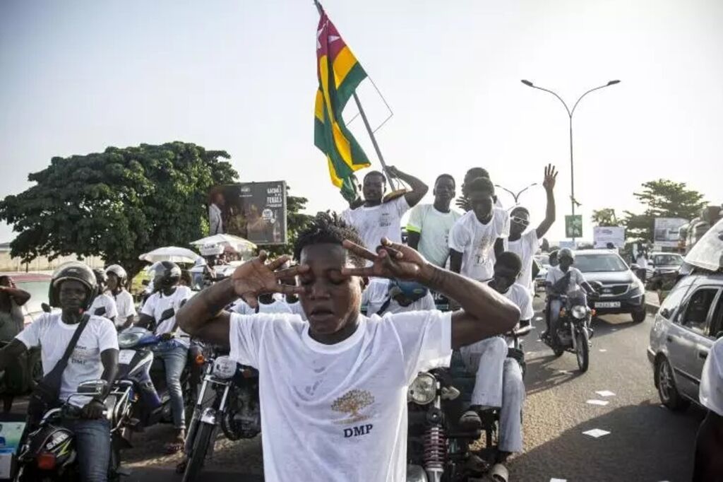 | Des partisans de la Dynamique pour la majorité du peuple (DMP, regroupement de partis d'opposition et d'organisations de la société civile), lors de la campagne électorale pour les législatives et régionales, à Lomé le 27 avril. |