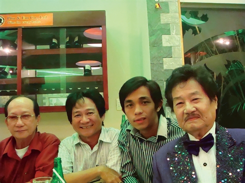 | L'harmoniciste Tong Son (droite) avec d'autres artistes lors de son 83e anniversaire, en mai 2012 |