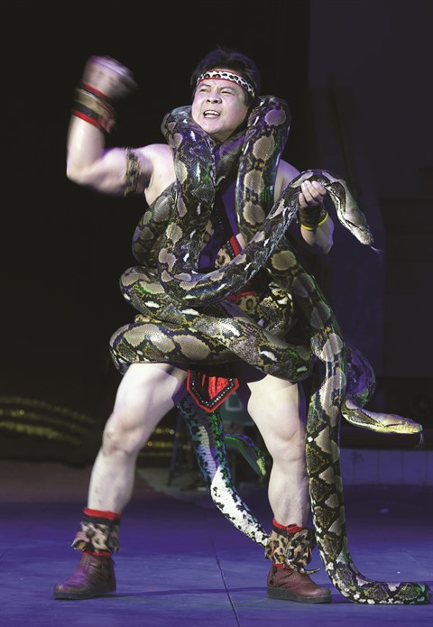 "Aimer les animaux, cela sert à évaluer la personnalité d’un homme et à mieux se comporter en tant qu’être humain". C’est cet état d’esprit qui a fait de lui, ces quatre dernières décennies, le dresseur de python N°1 au Vietnam. L’artiste Tông Toàn Thang a été attaqué trois ou quatre fois sur scène par ses reptiles. Cependant, cela ne l’a pas découragé et l’a poussé à se perfectionner.