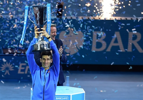 | Novak Djokovic brandit le trophée du Masters final, remporté face à Roger Federer, le 22 novembre |