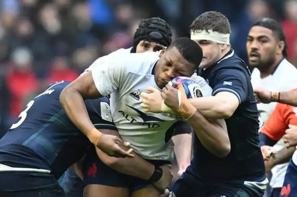 | Charge de Cameron Woki avec le XV de France contre l'Écosse dans le Tournoi des six nations en février au stade de Murrayfield à Edimbourg. |