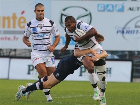 | Le Briviste Malakae Radikedike (droite) échappe au plaquage d'un Bordelais, le 24 août lors de la 2e journée de Top 14 de rugby |