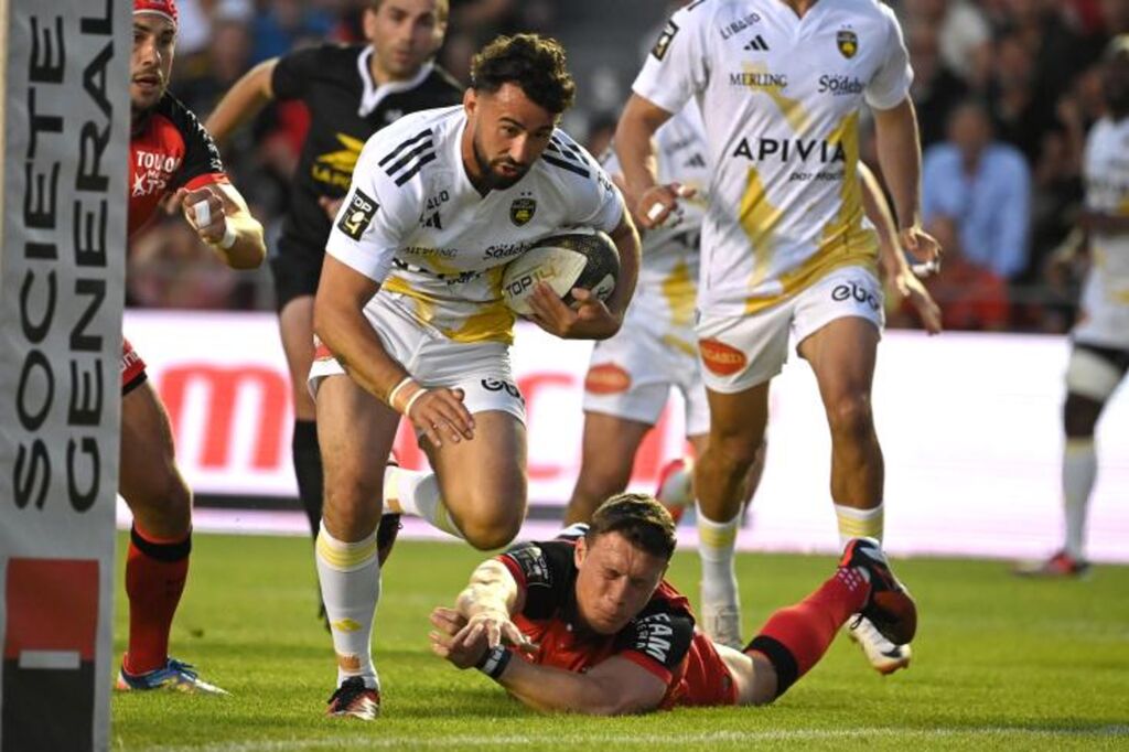 | Antoine Hastoy (cheveux bouclés) marque un essai pour La Rochelle à Toulon le 15 juin. |