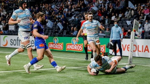 | Le centre Henry Chavancy marque l'un des 5 essais du Racing 92, victorieux de Castres, 45-25, lors de la 19e journée du Top 14, le 26 février à la Paris La Défense Arena à Nanterre. |