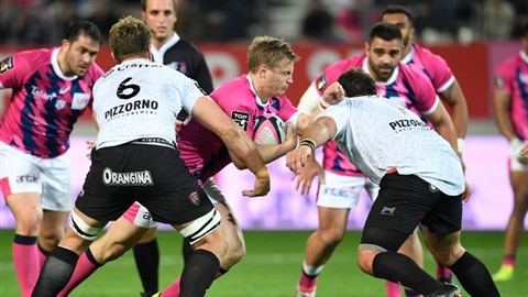 | Charge de Jules Plisson avec le Stade Français contre le RCT Toulon, en Top 14, le 26 mars à Paris. |