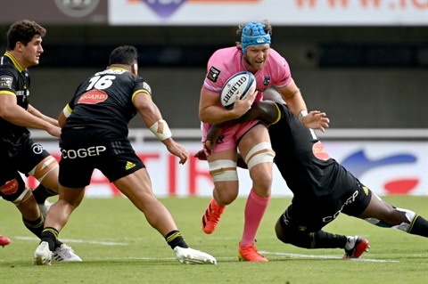 | Le 2e ligne sud-africain de Montpellier Nico Janse Van Rensburg tente de percer la défense rochelaise, lors de la 5e journée de Top 14, le 2 octobre au GGL Stadium. |