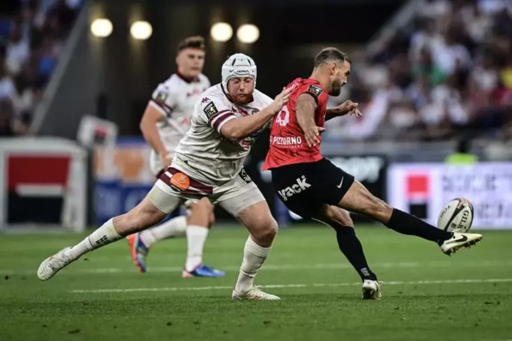 | Le joueur de Bordeaux-Bègles, Maxime Lucu, dégage le ballon lors de la demi-finale du championnat de France de rugb. |