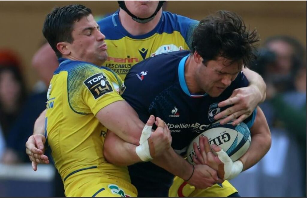 | Le centre de Montpellier Jan Serfontein à la lutte avec l'ailier de Clermont Bautista Delguy, le 4 mars 2023 à Montpellier. |