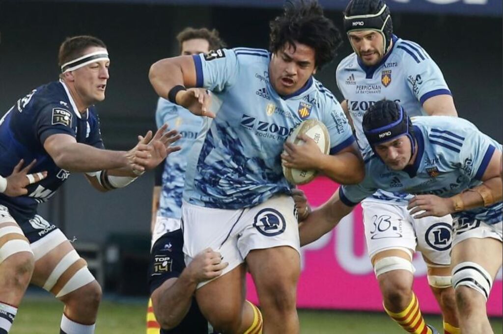 | Le 2e ligne de Perpignan Posolo Tuilagi (centre) à l'attaque contre l'Aviron Bayonnais, le 4 mars 2023 à Perpignan. |