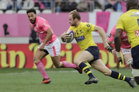 | Le Clermontois Nick Abendanon progresse avec le ballon face au Stade Français, lors d'un déplacement à Paris en Top 14, le 7 avril. |