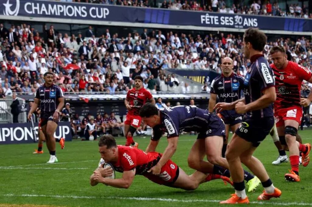 | Le centre toulousain Pierre-Louis Barassi marque un essai contre l'UBB en demi-finale de Champions Cup au stade Atlantique Bordeaux Métropole le 4 mai à Bordeaux en France |