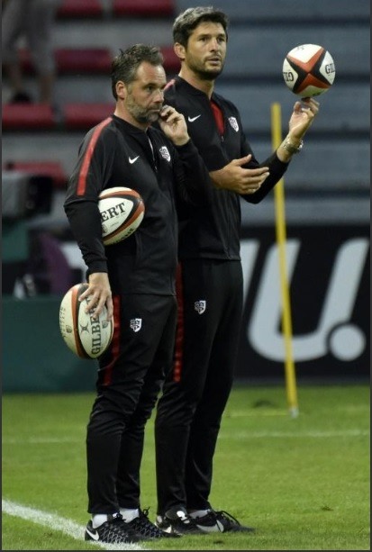 | L'entraîneur du Stade Toulousain, Ugo Mola (gauche), et l'entraîneur des avants Jean Bouilhou, lors d'un match de Top 14 à domicile face à Pau, le 2 septembre 2017. |