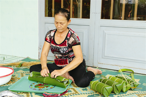 | Mme Sau maîtrise la technique d’emballage des banh tét depuis qu’elle a huit ans. Sa mère lui a transmis ce savoir-faire. |