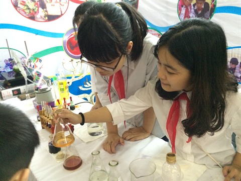| Deux collégiennes vietnamiennes lors d'un cours de pratique scientifique. |