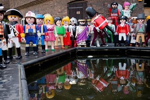 | Des figurines géantes de Playmobil sont exposées sur le canal à Camden, dans le nord de Londres en 2014, alors que l'entreprise de jouets fête ses 40 ans. |