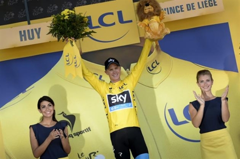 | Le Britannique Christopher Froome célèbre son maillot jaune à l'issue de la 3e étape du Tour de France, le 6 juillet à Huy (Belgique). |