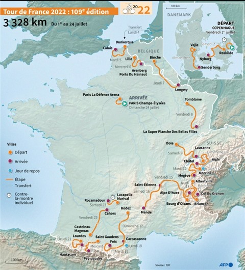 Une séquence de pavés au retour dans le nord de la France, les Alpes avant les Pyrénées, un long contre-la-montre de 40 kilomètres dans le Lot à la veille de l'arrivée sur les Champs-Élysées programmée le 24 juillet : plusieurs temps forts sont identifiés dans ce 109e Tour qui comporte sa part de nouveautés (trois jours au Danemark, le col pyrénéen de Spandelles) et de grands classiques.