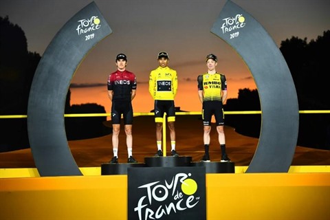 | Le Colombien Egan Bernal vainqueur du Tour de France le 28 juillet devant le Britannique Geraint Thomas (gauche) et lel Néerlandais Steven Kruijswijk |