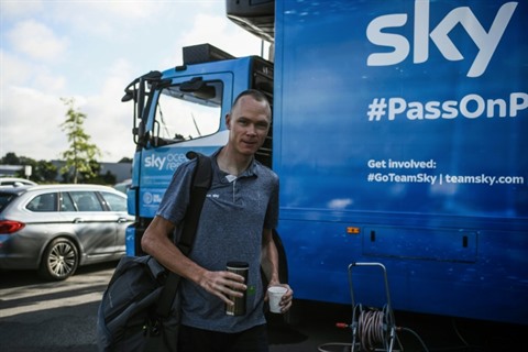 | Le Britannique Chris Froome devant le bus de son équipe, le 4 juillet à Saint-Mars-la-Réorthe en Vendée. |