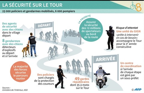 Sur l'ensemble du Tour, ce sont quelque 29.000 personnes qui seront en charge du service d'ordre, dont 23.000 policiers et gendarmes. "L'échelon course, dans lequel se trouve Froome, est largement protégé", estime le commandant Lothe.
