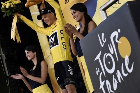 | Le Britannique Chris Froome pose sur le podium revêtu du maillot jaune de leader du Tour de France à l'issue de la 5e étape, le 5 juillet au Plancher-les-Mines. |