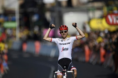 | Le Néerlandais de la Trek Bauke Mollema vainqueur en solitaire de la 15e étape du Tour de France au Puy-en-Velay, le 16 juillet. |