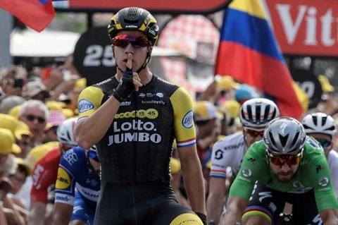 | Le Néerlandais Dylan Groenewegen, vainqueur de la 7e étape du Tour de France, le 13 juillet 2018. |