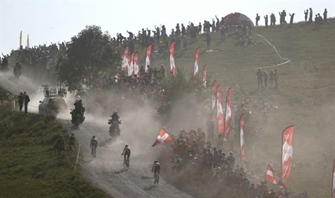 | Les coureurs Marc Soler, Wout van Aert et Luis Leon Sanchez sur les pentes de la montée vers le plateau des Glières lors de la 18e étape, le 17 septembre. |