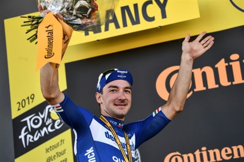 | Le sprinteur italien Elia Viviani vainqueur de la 4e étape du Tour de France à Nancy, le 9 juillet. |