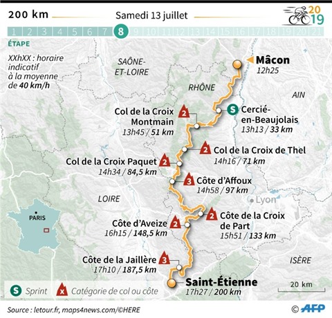 Les croix installées sur les différents sommets (Montmain, Thel, Paquet, Part) dans les Monts du Beaujolais puis du Lyonnais scandent les 200 kilomètres de ce parcours exigeant. Un point bonus (8, 5 et 2 sec aux trois premiers) est placé en haut de la dernière côte, à 12,5 kilomètres de l'arrivée.