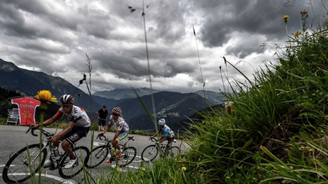 | Le Colombien Jarlinson Pantano (gauche) devance le meilleur grimpeur du Tour, le Polonais Rafal Majka, dans une montée lors de la 19e étape Albertville-Saint-Gervais Mont Blanc, le 22 juillet 2016. |