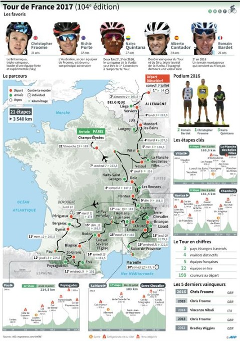 Le Tour de France 2017, qui débutera samedi 1er juillet à Düsseldorf, est long de 3540 kilomètres répartis sur 21 étapes.