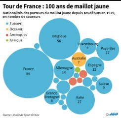 | Nationalités des porteurs du maillot jaune sur le Tour de France en nombre de coureurs depuis 1919 |