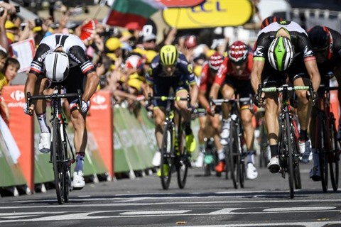 | L'Australien Michael Matthews (gauche) remporte la 16e étape du Tour de France, le 18 juillet à Romans-sur-Isère. |