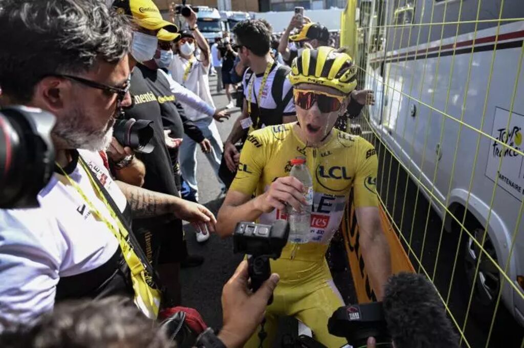 | Le Slovène de la formation UAE Tadej Pogacar se rafraichit après sa victoire lors de la 15e étape du Tour de France, au plateau de Beille, en France, le 14 juillet. |